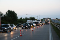 Ein kilometerlanger Stau war am Donnerstag nachmittag die Folge einer notwendigen Sperrung von gleich zwei Fahrbahnen auf der A1 zwischen den Anschlussstellen Bad Oldesloe und dem Kreuz Bargteheide. Aufgrund der sengenden Hitze hielt der Belag auf gleich zwei Fahrspuren der Sonneneinstrahlung nicht stand und ist an mehereren Stellen gebrochen. Mehere Betonstücke lagen auf der Fahrbahn. Ein aufewirbeltes Betonstück durchschlug die Windschutzscheibe eines Lkw. Der Fahrer blieb unverletzt.