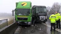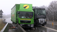 Das Autobahnkreuz Bargteheide, welches die A1 und die A21 / B404 verbindet, wurde am Dienstag morgen gegen 10 Uhr einer 54-jährigen Fahrerin eines Lastwagens zum Verhängnis. Beim Versuch sich von der A1 kommend auf die Fahrbahn, des sich genau an dieser Stelle einspurig gewordenen Übergangsstück der A21 zur B404 einzufädeln, hat sie wohl die Geschwindigkeit eines von der A21 kommenden 40-Tonners unterschätzt. Beim Einfädeln wurde der LKW seitlich vom 40-Tonner erfasst und rechts in die Betonbegrenzung der Fahrbahn gedrückt. Dabei wurden beide Fahrzeuge beschädigt und die beiden Fahrzeuglenker verletzt. Aufgrund der Meldung einer der Fahrer sei eingeklemmt, wurden die Feuerwehren Bargteheide und Hammoor zur Unfallstelle gerufen. Dies hat sich glücklicherwiese nicht bestätigt und die beiden Verletzten konnten noch vor Eintreffen der Feuerwehr vom Rettungsdienst aus den Fahrzeugen geholt werden. Ein Schäferhund, welcher sich im Fahrzeug der Unfallverursacherin befunden hat, blieb unverletzt und konnte einige Zeit später von einem Kollegen aus dem Führerhaus geholt werden. Die beiden Verletzten wurden mit Rettungswagen in umliegende Krankenhäuser gebracht. Während der Bergungsarbeiten blieb die Richtungsfahrbahn Berlin / Schwarzenbek voll gesperrt.