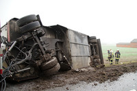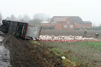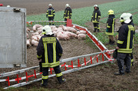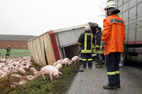 am heutigen morgen ist auf der Fahrt zwischen Kasdorf und Siebenbäumen der Fahrer eines Viehtransportes mit seinem Hängergespann auf die unbefestigte Bankette geraten. Dabei ist der Hänger umgekippt. Die geladenen Ferkel sind dadurch ins Freie geraten und haben sich zum größten Teil im angrenzenden Feld und auf der Bankette zum Fressen gesammelt. Einige Ferkel sind in Panik auf einen benachbarten Hof und weiter ins Feld gelaufen. Die alarmierten Helfer der Feuerwehren Kasdorf, Sierksrade und Rondeshagen wurden mit der Aufgabe betraut sowohl die entlaufenen Ferkel wieder einzufangen, wie auch die sich auf dem Feld versammelten Ferkel mittels Leiter-Gatter im Zaun zu halten. Etwa 20 ferkel haben den Unfall nicht überlebt. Eine herbeigerufene Kreisveterinärin hat sich vor Ort vom Zustand der transportierten Ferkel überzeugt. Der Fahrer des Vietransportes blieb unverletzt.