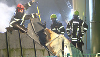 Aus noch unbekannten Gründen ist am Dienstagabend das Blockheizkraftwerk an der Oldesloer Schwimmhalle in Brand geraten. Meterhohe Flammen schlugen aus dem Dach, als die Feuerwehr kurz vor 20 Uhr alarmiert wurde. Die Brandbekämpfer rückten unter Atemschutz gegen das Feuer vor.