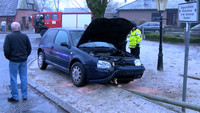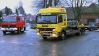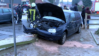 Mehr Dramaturgie hätte sich ein Schutzengel für seinen Einsatz kaum ausdenken können. Gegen 14:45 Uhr kam der Fahrer eines Golfes bei spiegelglatter Fahrbahn im Sprenger Weg von der Fahrbahn ab und prallte mit seinem Fahrzeug frontal gegen einen Zaun. Trotz niedriger Geschwindigkeit war der Aufprall derart heftig, dass sich eine massive Latte des Zaunes durch den Motorraum zwischen Oberkörper und Arm des Beifahrers hindurch durch die gesamte Fahrgastzelle bohrte. Kaum zu glauben, dass beide Fahrzeuginsassen nur leicht verletzt mit Rettungswagen in umliegende Krankenhäuser gebracht wurden.