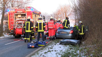 Ursächlich für den Unfall war offenbar die glatte Fahrbahn. Eine 22-jährige Frau kam mit ihrem Opel Astra auf die Gegenfahrbahn, touchierte erst den BMW eines 34-Jährigen und krachte anschließend frontal in einen Skoda. Die Feuerwehr musste das Dach des Wagens entfernen, um die Skoda-Fahrerin zu befreien.