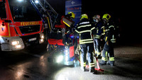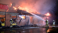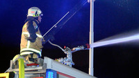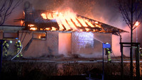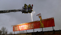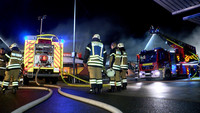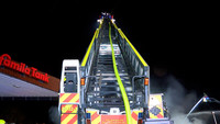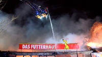 Von Samstag auf Sonntag ist es in der Nacht in Stockelsdorf zu einem Großbrand gekommen. Gegen 02:30 Uhr gingen die Melder der Freiwilligen Feuerwehr. Ein Wachmann hatte zuvor über den Notruf ein Feuer in einem Geschäft für Heimtierbedarf auf dem Famila-Gelände im Ravensbusch gemeldet. Zu diesem Zeitpunkt schlugen schon Flammen aus dem Dach des rechten Gebäudeteiles. Nach dem Eintreffen der ersten Einsatzkräfte hatten sich diese schon ihren Weg durch die Dachhaut gesucht und haben sich über den gesamtem Gebäudekomplex ausgebreitet. Umgehend wurde das Einsatzstichwort auf FEU2 und schlussendlich auf FEU5 erhöht. Mit den Drehleitern der Freiwilligen Feuerwehren Mori und Bad Schwartau sowie mit mehreren Strahlrohren wurde von allen Seiten die Brandbekämpfung aufgenommen. Dabei galt es, den Brand möglichst schnell unter Kontrolle zu bekommen und damit ein Übergreifen auf benachbarte Gebäude und vor allem auf die direkt neben dem Brandort liegende Tankstelle zu verhindern. An einen Innenangriff war schon zu Einsatzbeginn nicht mehr zu denken, wie Stockelsdorf Gemeindewehrführer Günter Volgmann berichtet. „Das Gebäude ist akut einsturzgefährdet. Unsere Einsatzkräfte dürfen es nicht mehr betreten.“ Die schnelle Ausbreitung des Brandes ist laut Volgmann der Bauart des Hauses geschuldet. In der Holzkonstruktion des Daches hatten die Flammen leichtes Spiel sich auszubreiten. „Wenn Holz an irgendeiner Seite anfängt zu brennen und bekommt Luft, dann zieht das Feuer durch. Und das rasend schnell!“, erklärt er im Interview. Um an alle Glutnester zu gelangen, ließ Volgmann das THW alarmieren, welches mit schwerem Gerät Teile des Gebäudes einrissen.