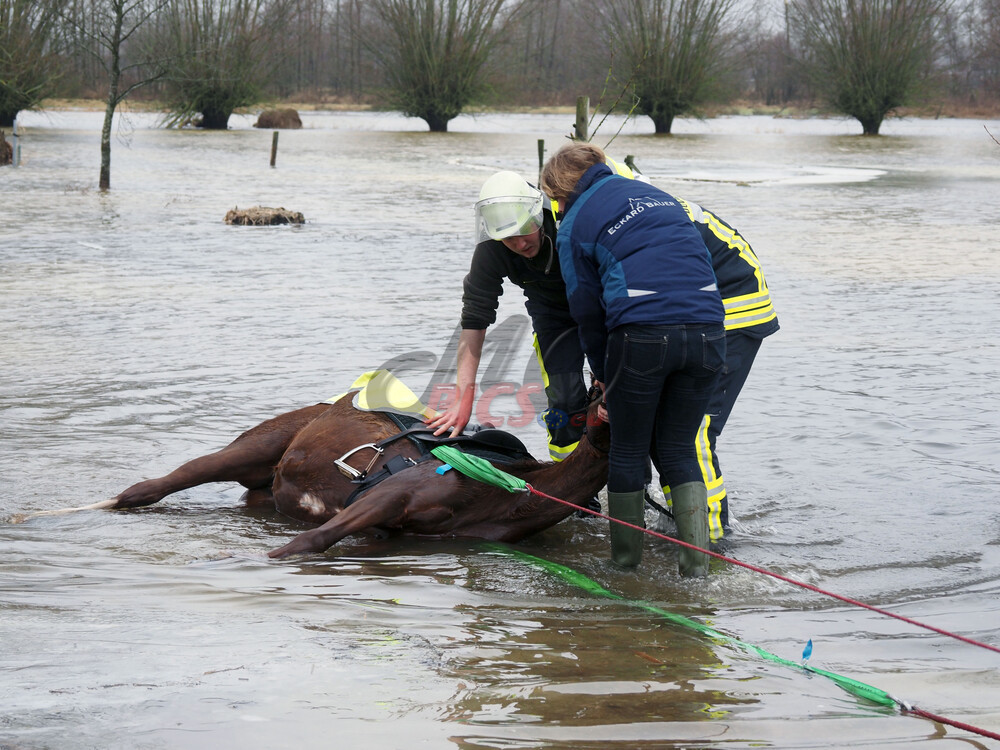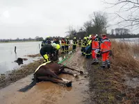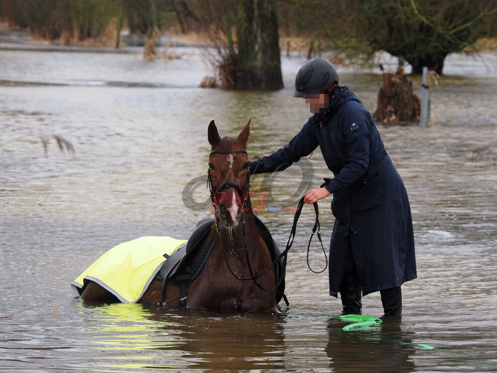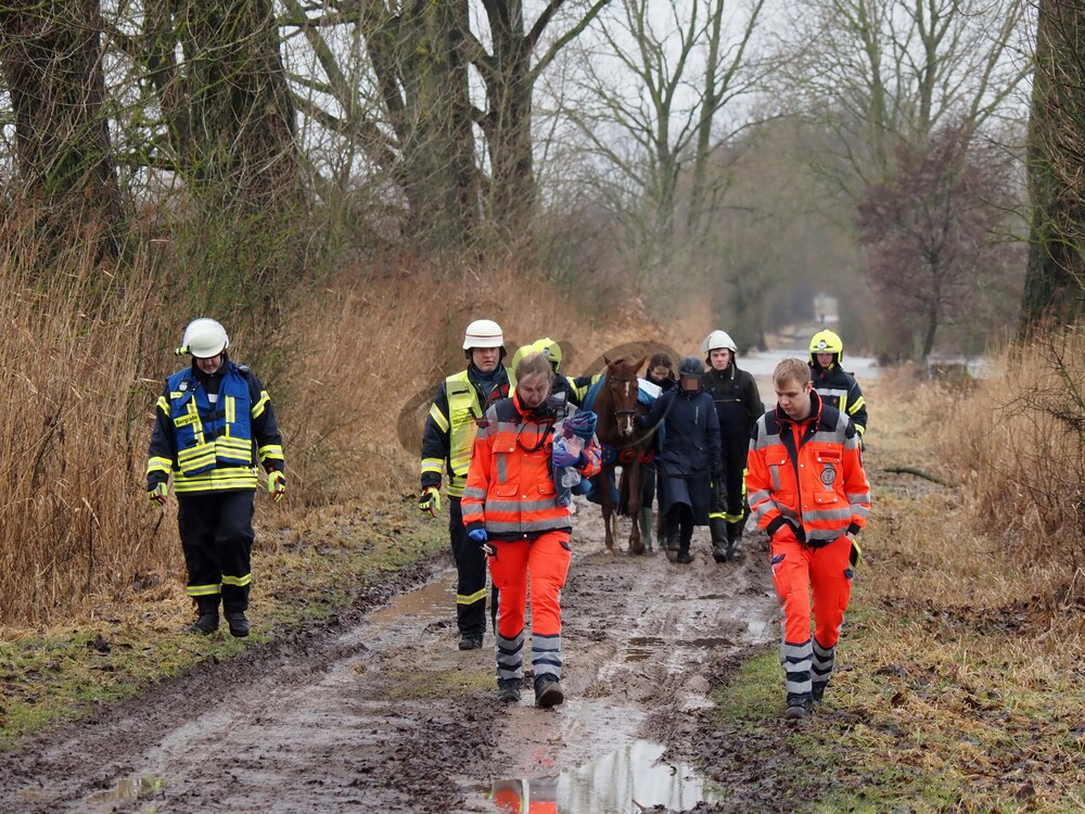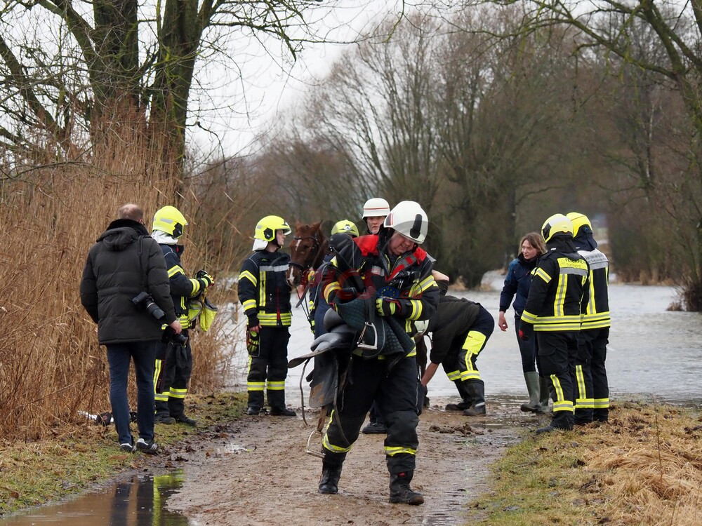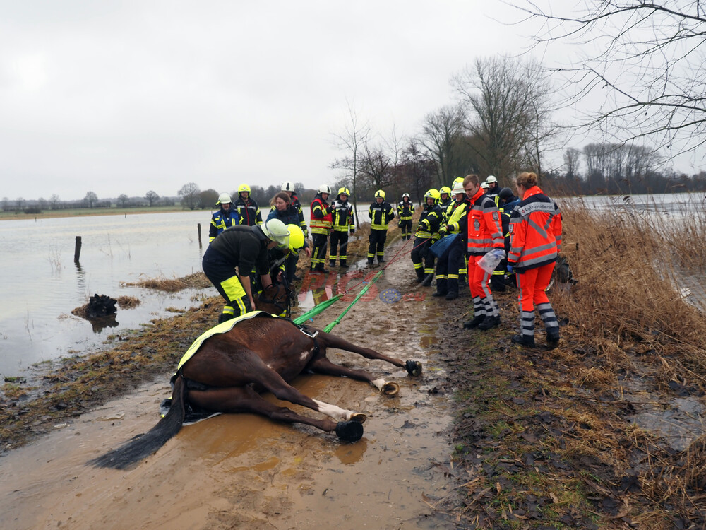 Eine Reiterin war während eines Ausrittes mit ihrer achtjährigen Stute Holly auf dem durch überflutete Felder führenden Niedeweg unterwegs. Der Weg war ebenfalls stark überspült. Beim Durchreiten des Wassers trat Holly auf eine unter der Oberfläche liegende Eisplatte und rutschte aus. Aus eigener Kraft konnte das Tier die Eisplatte nicht verlassen und lag hilflos im Wasser. Die Besitzerin und zwei Feuerwehrhelfer blieben bei Holly, bis eine Tierärztin eintraf. Erst nach einer Sedierung gelang es den Einsatzkräften, die mehrere hundert Kilo schwere Stute von der Eisfläche auf sicheren Boden zu ziehen. Anschließend wurde das Tier in Begleitung der Tierärztin zu einem nahegelegenen Reiterhof gebracht, wo ein Pferdesolarium für die völlig durchnässte Holly vorbereitet war.