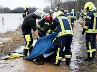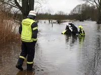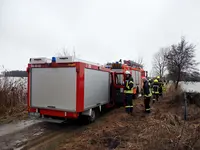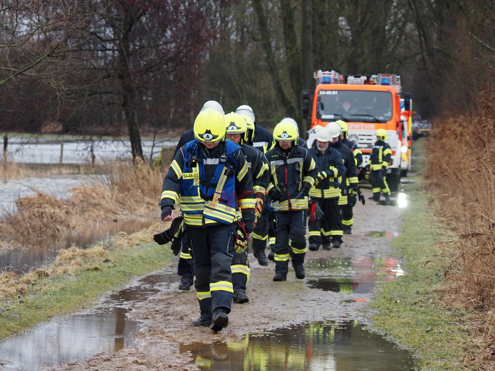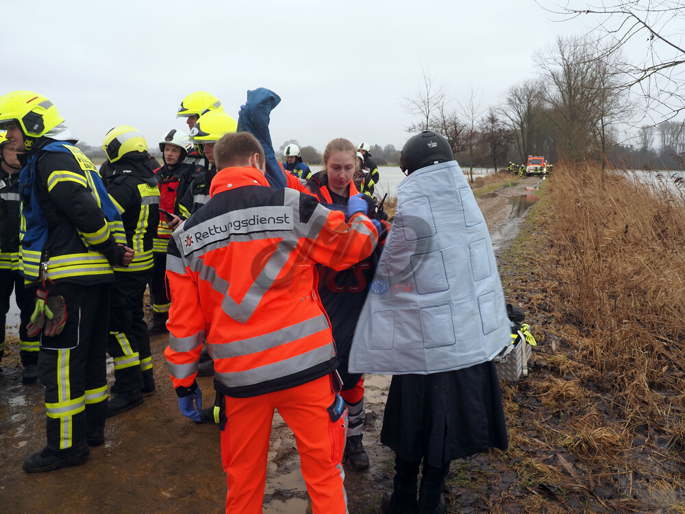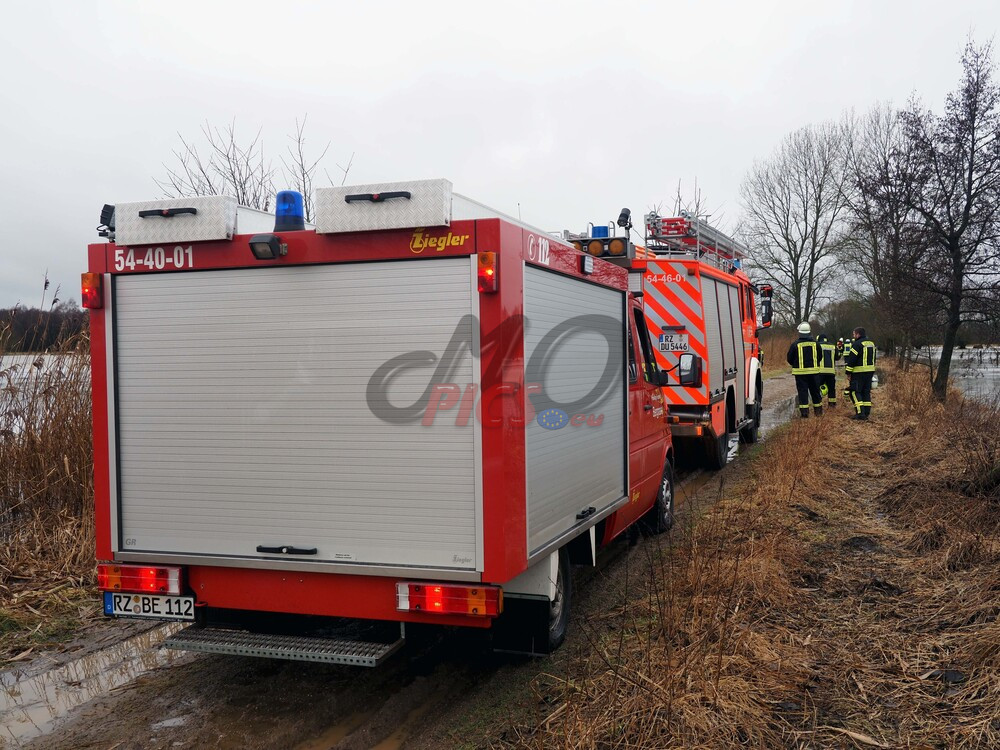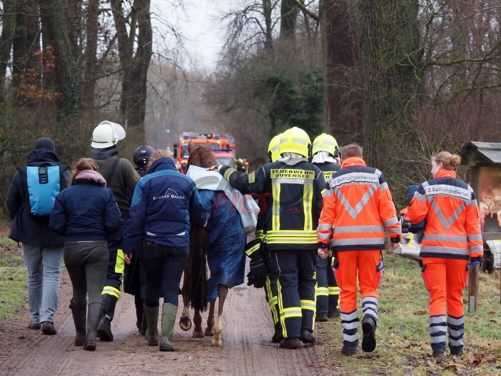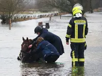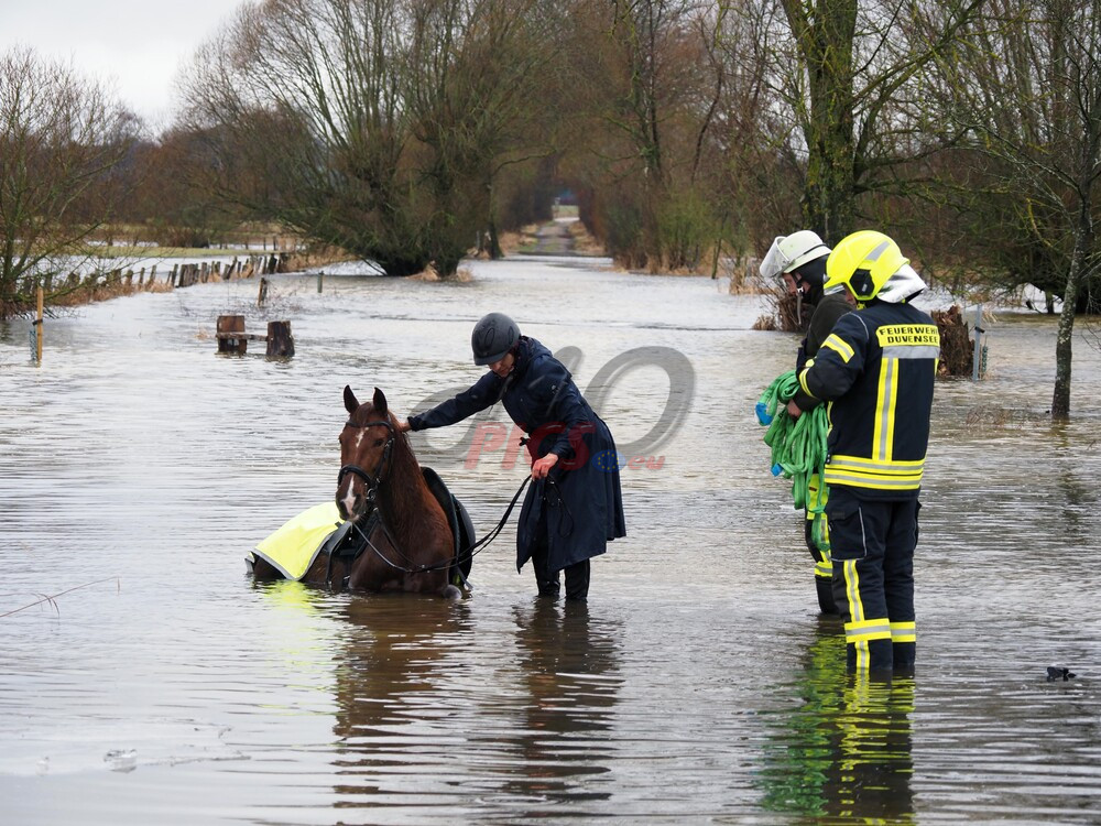 Eine Reiterin war während eines Ausrittes mit ihrer achtjährigen Stute Holly auf dem durch überflutete Felder führenden Niedeweg unterwegs. Der Weg war ebenfalls stark überspült. Beim Durchreiten des Wassers trat Holly auf eine unter der Oberfläche liegende Eisplatte und rutschte aus. Aus eigener Kraft konnte das Tier die Eisplatte nicht verlassen und lag hilflos im Wasser. Die Besitzerin und zwei Feuerwehrhelfer blieben bei Holly, bis eine Tierärztin eintraf. Erst nach einer Sedierung gelang es den Einsatzkräften, die mehrere hundert Kilo schwere Stute von der Eisfläche auf sicheren Boden zu ziehen. Anschließend wurde das Tier in Begleitung der Tierärztin zu einem nahegelegenen Reiterhof gebracht, wo ein Pferdesolarium für die völlig durchnässte Holly vorbereitet war.