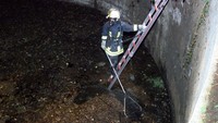 Mit 8 Kameraden rückte die Benstakener Feuerwehr ins dreieinhalb Kilometer entfernte Barnitz aus. Ganz so einfach war die Aufgabe nicht. Die sich auf dem Hof befindliche, gut mit Bauzäunen gesicherte Güllegrube erwies sich als echte Herausforderung. Neben dem, dass das kleine Kaninchen in der rieseigenen Grube kaum zu sehen war, rannte dieses bei jedem Annäherungsversuch munter an der Umrandung entlang. In gemeinsamer Beratung entschied man sich schlussendlich dafür, zwei Kameraden unter Atemschutz und Wathose in die Güllegrube hinabsteigen zu lassen. Der findige Einfall eines der anwesenden Feuerwehrmänner brachte schlussendlich auch noch ein Strahlrohr ins Spiel. Mit gezieltem Wasserstrahl wurde das, nach stundenlangem Verharren in der Grube schon deutlich geschwächte, Kaninchen in eine Richtung an der Umrandung entlang getrieben. Am unteren Ende einer in der Grube stehenden Leiter wartete ein weiterer Kamerad mit einem großen Käscher auf den Mümmelmann. Tatsächlich, nach einer gefühlten Ewigkeit lief das Kaninchen genau in den Käscher und konnte von den sichtlich erleichterten Feuerwehrmännern in Empfang genommen werden. Pudelnass und durch und durch mit Gülle besudelt, brachte die Besitzerin des Hofes und zufällig auch Tierärztin, das geschundene Jungkaninchen in die Lübecker Tierklinik.